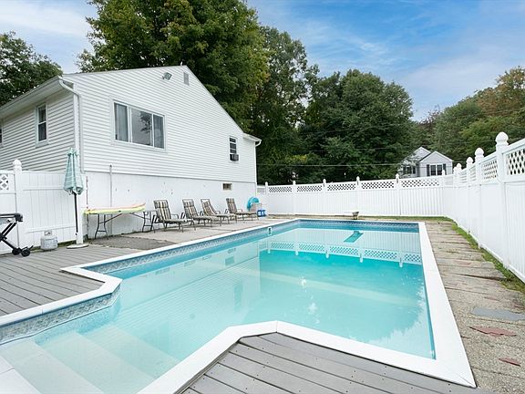 Welcome to this charming & well-maintained oversized ranch in Webster, MA, offering easy one-level living on a quiet dead-end street! The inviting eat-in kitchen offers ample cabinet space & stainless steel appliances. The large bay window in the living room fills the space with natural light, highlighting the gleaming oak hardwood floors & updated fireplace. This home offers 3 generously sized bedrooms with hardwood floors, a full bath with a linen closet, & a sunny den. Need more space? The office/study leads to a private 17x20 Trex deck overlooking a vinyl-fenced yard, perfect for outdoor gatherings! The finished lower level boasts a spacious game room with a half bath, & a separate shower; giving you the feel of a second full bathroom. Outside, you'll find a large, fenced-in yard complete with a 16x32 inground pool, plenty of space to lounge, & a hot tub built into the deck! Your home will feel like your own personal retreat! Conveniently located minutes from Rt. 395 & Webster Lake