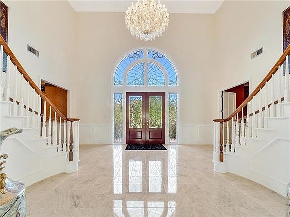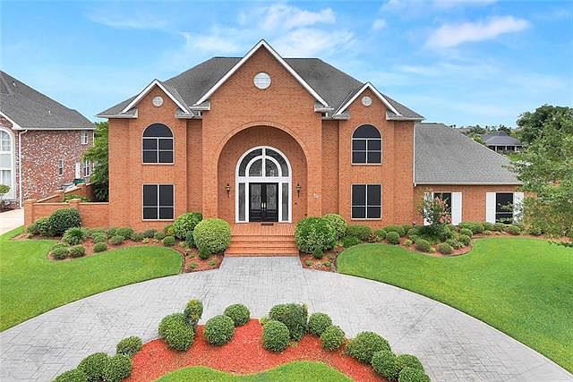 Stunning custom-built luxury home on a double lot; gated community; waterfront with navigable waters. This home features a grand marble foyer with double staircase; a kitchen sure to satisfy any chef, complete w/ cherry cabinets, SS appliances, and large pantry; mahogany paneled den w/ wet bar; generously-sized rooms throughout; multiple bonus rooms; whole-house generator; in-ground pool; cabana; pristine landscaping; 3-car garage; large dock w/ boat house and lift; and so much more! TRULY A MUST SEE!