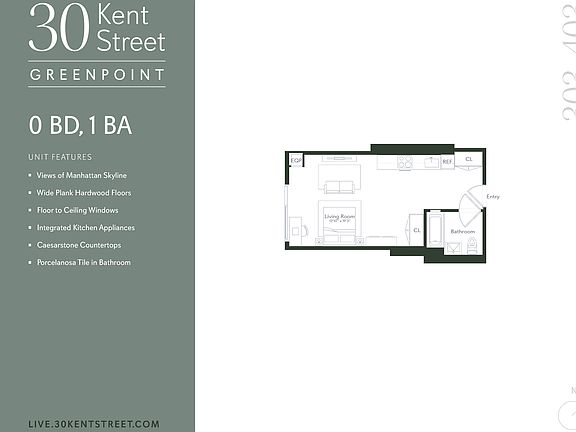 Welcome home to 30 Kent Street. Greenpoint's new luxury waterfront rental building. This spacious studio, 1 Bath is ideally laid out for living and sleeping. The unit is equipped with wide plank hardwood flooring, custom cabinetry, integrated kitchen appliances, floor-to-ceiling windows, and Porcelanosa tile in the bathroom. 30 Kent Street provides residents with sweeping views of the Manhattan skyline and is only steps away from WNYC Transmitter Park. 30 Kent Street offers studio, one- and two-bedroom units. Amenities include The Deck, an expansive outdoor space, The Garden, and a fitness center. Residents can enjoy The Loft, a private area with couches, desks, and individual workspaces. No amenity fee. Limited interior and exterior parking spots are available.