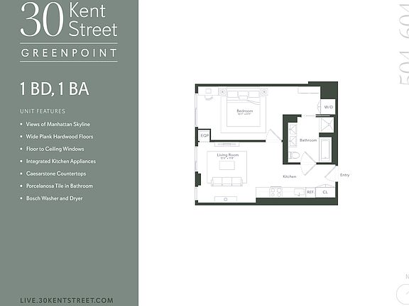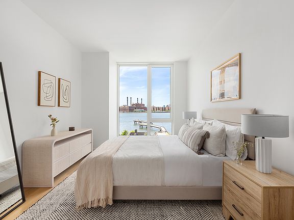Welcome home to 30 Kent Street. Greenpoint's new luxury waterfront rental building. This spacious 1 Bed, 1 Bath with a private balcony is ideally laid out for living and sleeping. The unit is equipped with wide plank hardwood flooring, custom cabinetry, integrated kitchen appliances, floor-to-ceiling windows, Porcelanosa tile in the bathrooms, and a Bosch W/D in the unit. 30 Kent Street provides residents with sweeping views of the Manhattan skyline and is only steps away from WNYC Transmitter Park. 30 Kent Street offers studio, one- and two-bedroom units. Amenities include The Deck, an expansive outdoor space, The Garden, and a fitness center. Residents can enjoy The Loft, a private area with couches, desks, and individual workspaces. No amenity fee. The virtual doorman is powered by the Carson app. Limited interior and exterior parking spots are available.