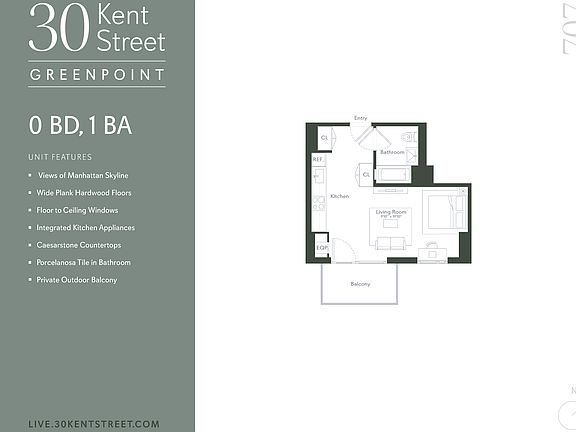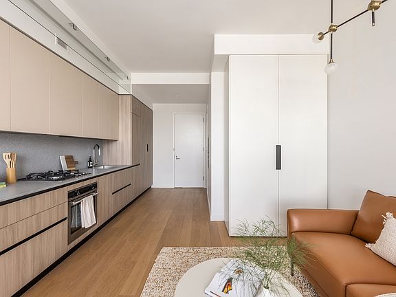 Welcome home to 30 Kent Street. Greenpoint's new luxury waterfront rental building. This spacious studio, 1 Bath is ideally laid out for living and sleeping. The unit is equipped with wide plank hardwood flooring, custom cabinetry, integrated kitchen appliances, floor-to-ceiling windows, and Porcelanosa tile in the bathroom. 30 Kent Street provides residents with sweeping views of the Manhattan skyline and is only steps away from WNYC Transmitter Park.