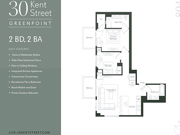 Welcome home to 30 Kent Street. Greenpoint's new luxury waterfront rental building. This spacious 2 Bed, 2 Bath with two private balconies is ideally laid out for living and sleeping. The unit is equipped with wide plank hardwood flooring, custom cabinetry, integrated kitchen appliances, floor-to-ceiling windows, Porcelanosa tile in the bathrooms, and a Bosch W/D in the unit. 30 Kent Street provides residents with sweeping views of the Manhattan skyline and is only steps away from WNYC Transmitter Park. 30 Kent Street offers studio, one- and two-bedroom units. Amenities include The Deck, an expansive outdoor space, The Garden, and a fitness center. Residents can enjoy The Loft, a private area with couches, desks, and individual workspaces. No amenity fee. The virtual doorman is powered by the Carson app. Limited interior and exterior parking spots are available.