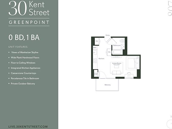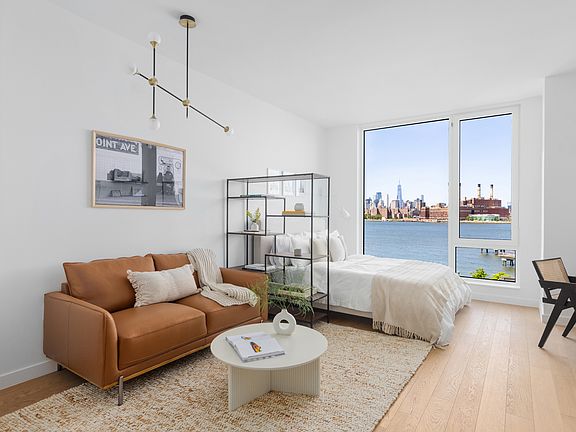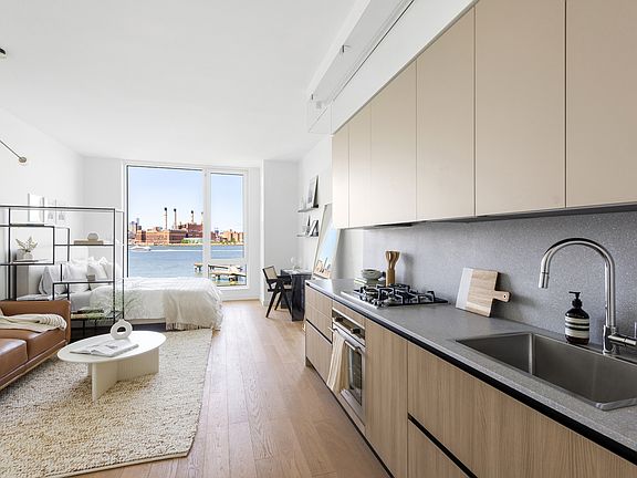 Welcome home to 30 Kent Street. Greenpoint's new luxury waterfront rental building. This spacious studio, 1 Bath with a private balcony is ideally laid out for living and sleeping. The unit is equipped with wide plank hardwood flooring, custom cabinetry, integrated kitchen appliances, floor-to-ceiling windows, and Porcelanosa tile in the bathroom. 30 Kent Street provides residents with sweeping views of the Manhattan skyline and is only steps away from WNYC Transmitter Park. 30 Kent Street offers studio, one- and two-bedroom units. Amenities include The Deck, an expansive outdoor space, The Garden, and a fitness center. Residents can enjoy The Loft, a private area with couches, desks, and individual workspaces. No amenity fee. Limited interior and exterior parking spots are available.