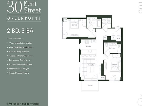 Welcome home to 30 Kent Street. Greenpoint's new luxury waterfront rental building. This spacious 2 Bed, 2.5 Bath with a private balcony is ideally laid out for living and sleeping. The unit is equipped with wide plank hardwood flooring, custom cabinetry, integrated kitchen appliances, floor-to-ceiling windows, Porcelanosa tile in the bathrooms, and a Bosch W/D in the unit. 30 Kent Street provides residents with sweeping views of the Manhattan skyline and is only steps away from WNYC Transmitter Park. 30 Kent Street offers studio, one- and two-bedroom units. Amenities include The Deck, an expansive outdoor space, The Garden, and a fitness center. Residents can enjoy The Loft, a private area with couches, desks, and individual workspaces. No amenity fee. The virtual doorman is powered by the Carson app. Limited interior and exterior parking spots are available.