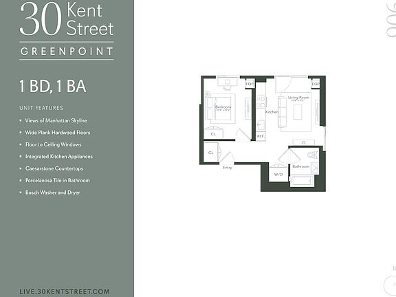 Welcome home to 30 Kent Street. Greenpoint's new luxury waterfront rental building. This spacious 1 Bed, 1 Bath with a private balcony is ideally laid out for living and sleeping. The unit is equipped with wide plank hardwood flooring, custom cabinetry, integrated kitchen appliances, floor-to-ceiling windows, Porcelanosa tile in the bathrooms, and a Bosch W/D in the unit. 30 Kent Street provides residents with sweeping views of the Manhattan skyline and is only steps away from WNYC Transmitter Park. 30 Kent Street offers studio, one- and two-bedroom units. Amenities include The Deck, an expansive outdoor space, The Garden, and a fitness center. Residents can enjoy The Loft, a private area with couches, desks, and individual workspaces. No amenity fee. The virtual doorman is powered by the Carson app. Limited interior and exterior parking spots are available.