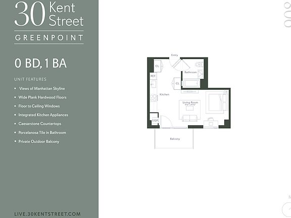 Welcome home to 30 Kent Street. Greenpoint's new luxury waterfront rental building. This spacious studio, 1 Bath with a private balcony is ideally laid out for living and sleeping.