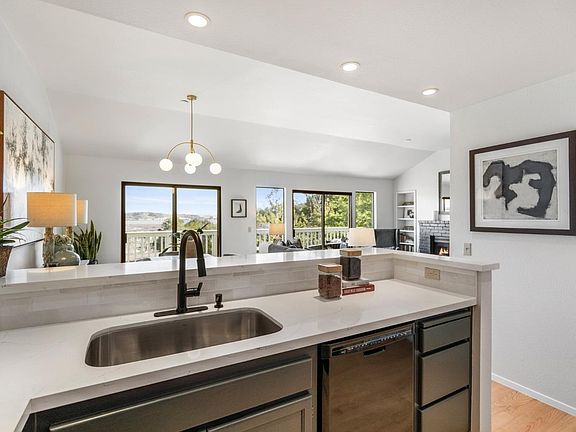 Beautiful & spacious townhouse lives like a single family home in Quarry Meadows with VIEWS of the Bay. You enter a pastoral, peaceful & natural world with blooming cherry trees, designed for the views and privacy. The open floor plan of kitchen, dining and living rooms has a wall of glass to the view & deck with 2 sets of sliding glass doors. The kitchen has a new stainless refrigerator, extra large stainless sink & quartz counters with a breakfast bar that opens to the dining & living space plus view & deck. Flow into the living room with a gas fireplace, a wet bar, and the view. A stylish powder room & the 2 car garage access complete the main level. There are 2 spacious bedrooms & 2 bathrooms, 1 en suite. plus a spacious laundry room downstairs. Located on 21 acres & surrounded by open space, highly desirable Quarry Meadows complex has a well-maintained HOA. Conveniently located near Town Center & the Village Shopping Center plus restaurants, parks + schools. Near Mill Valley, Larkspur Landing & the town of Larkskspur, Quarry Meadows is an easy commute to SF, 12 miles to the Marina.