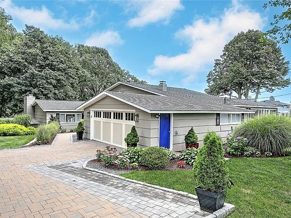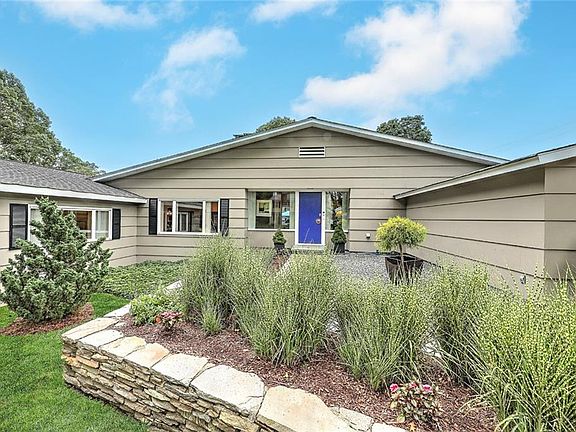 Welcome to this spectacular Mid-Century Modern residence overlooking Narragansett Bay. Set on a stunning, acre lot with mature plantings, come enjoy single level living at its finest. From the paver driveway, to the fantastic multi-tiered stone patio overlooking the Bay, this home will delight you at every turn. Enter the front door and step into an open concept living space with high ceilings and floor to ceiling glass with views of the Bay. The eat-in kitchen opens directly into the dining area and living room, exemplifying the homes fantastic flow. The double height, sunken living room features a grand fireplace, beautiful wood beamed ceiling and sliding doors to enjoy seamless indoor/outdoor living. On the opposite side of the kitchen is an inviting family room with another fireplace, more sliding glass doors, and a homey window seat. The bedroom wing offers two sizable bedrooms, a large guest bathroom with recycled glass tile floor, and tons of storage closets. At the end of the hall is a fantastic primary suite, featuring stunning views of the Bay, sliders to the patio and a full bathroom. A convenient laundry room, with access to the basement, and a large 2 car garage round out the home. The backyard is your own oasis, with stunning views, plantings and plenty of seating areas. A bonus feature is the 2 sheds, both with electricity, which provide extra storage or a fun bonus space. With close proximity to Warwick Country Club, and the water, this home is hard to beat!