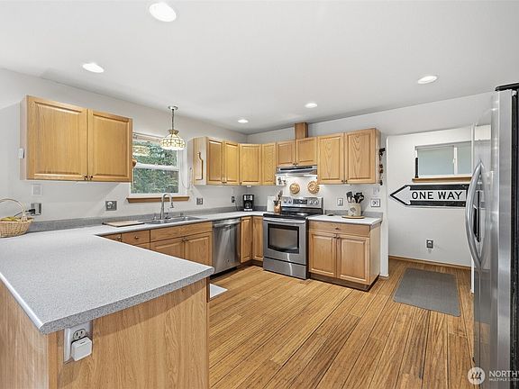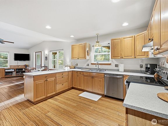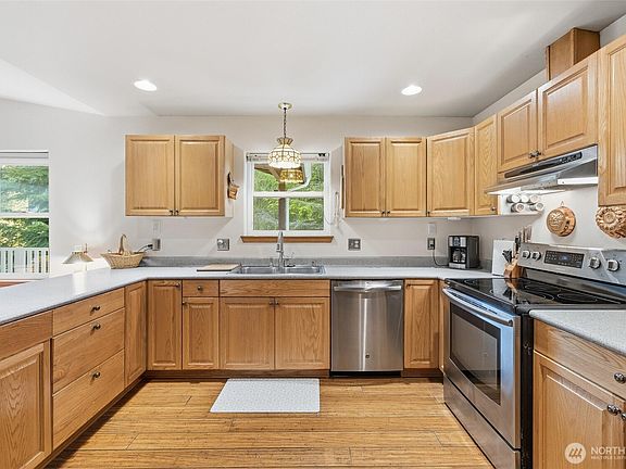 Well-kept 4-bed 2-bath Sudden Valley home with all rooms on one level. Open kitchen leads into spacious living room all with beautiful bamboo floors & flooded with natural light. With vaulted ceiling and stone hearth-fireplace it is cozy & welcoming. Generous sized covered deck off living room great for enjoying the natural setting amongst the trees. Primary bedroom with en-suite closet and private back deck. Additional 3 bedrooms perfect for space that can be used for bonus rooms, office etc. 2 car garage with built-ins for storage & work space. Low maintenance yard. All situated in a beautiful area with amenities including trails, pool, golf course, marina & more!