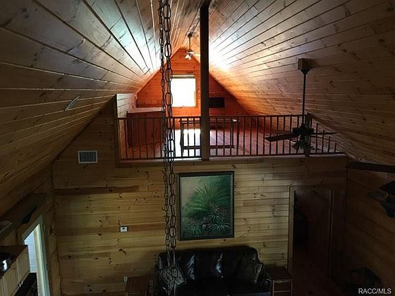 Waterfront log cabin with deep water canal and huge boat slip.Spiral staircase, vaulted ceilings and split floor plan .