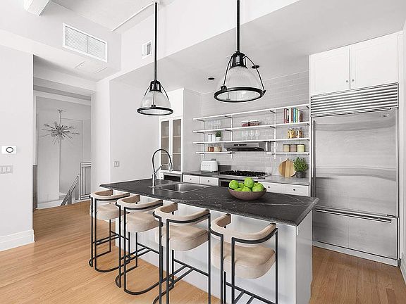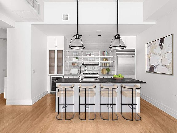 This open floor plan welcomes you into an expansive living and dining area, complete with an EcoSmart fireplace and a conveniently located powder room just off the entry hall. The spacious layout offers incredible flexibility, easily accommodating a variety of arrangements to suit your everyday needs. The soaring ceilings, oversized windows and a quaint view overlooking the cobblestone streets of historical DUMBO is one of the many highlights of this home.