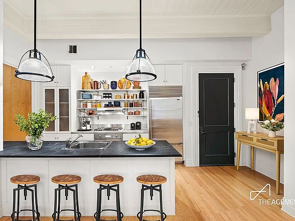 The 40-foot-long living, dining, and kitchen space offers seamless open design. The gourmet kitchen is outfitted with a large stone peninsula, perfect for both prep work and casual seating for up to four. It features premium appliances such as a Sub-Zero refrigerator, a newly installed Thermador range, Bosch dishwasher, and a coveted garbage disposal. White shaker cabinets and sleek open shelving provide additional storage while enhancing the modern aesthetic.
