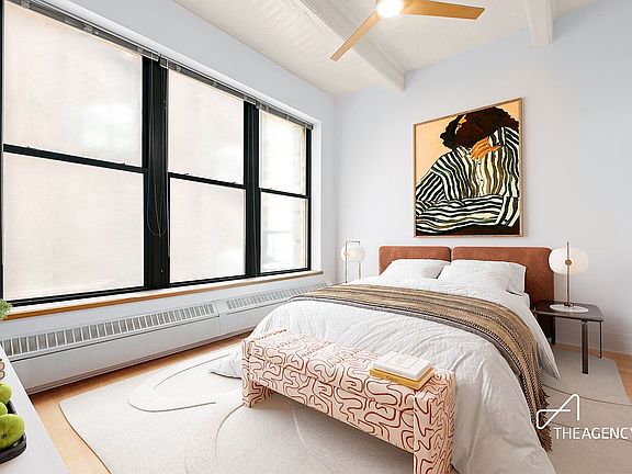 Featuring floor-to-ceiling windows, central air, hardwood floors, and iconic beamed ceilings, this loft embodies luxury living. Situated in the historic Sweeney Building, a full-service condominium from the early 1900s, residents enjoy 24-hour doorman service, a fitness center, rooftop deck, storage units, and a bike room. The location offers easy access to multiple subway lines (A/C, F, 2/3, R, 4/5) and the Fulton Ferry Landing. Please note that photos have been virtually staged. Pets are welcome.
