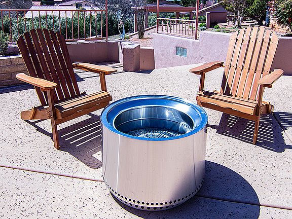 Multiple outdoor spaces include a dining area, an outdoor couch and umbrellas, and comfy adirondack chairs to star gaze or watch the fire. The house also has a drive-in garage if desired.