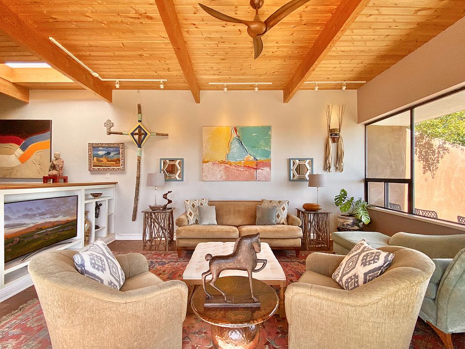 WELCOME HOME! - THE perfect high desert retreat in the highly desirable La Luz planned community. The award winning design by Architects Antoine Predock and H. Barker, features expansive views, amazing light, masterful use of adobe, wood and brick. The beautifully appointed corner residence features a perfectly scaled Great Room with amazing views, high ceilings, custom built-ins and fireplace. It overlooks a landscaped terrace with water feature. The Open Plan living extends into the Dining Alcove with skylight, to the kitchen island, new countertops, original maple cabinets and Breakfast Nook off the intimate patio. The en-suite Main Bedroom has a new Bathroom, Laundry, Custom Closet and Sunroom. Plus an extra Bedroom, Bathroom + plenty of closets, 2 car Garage and a Community Pool too!