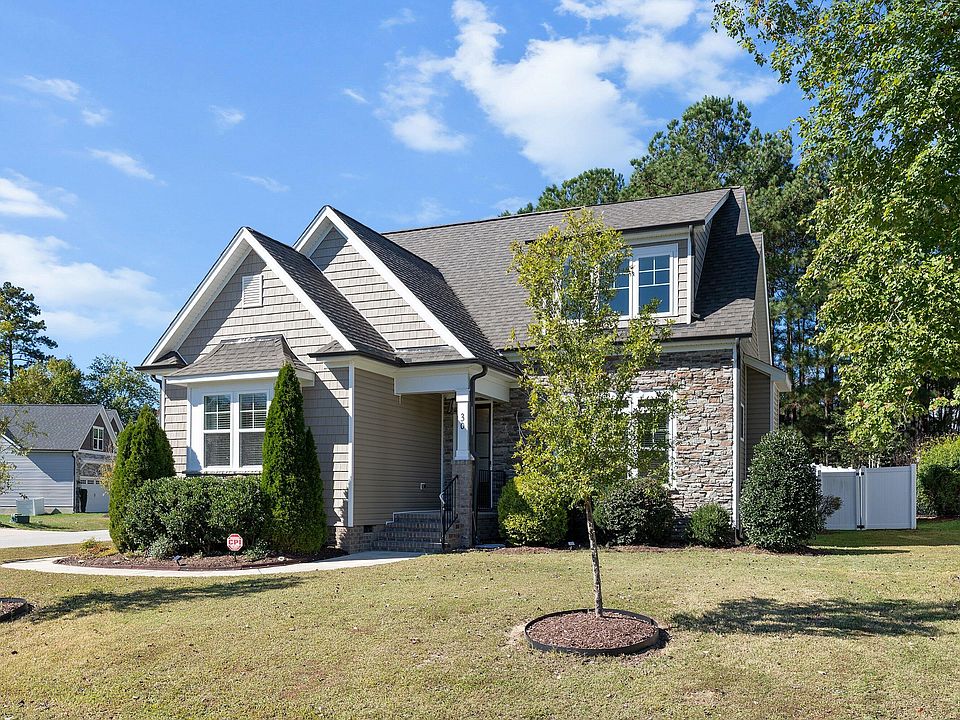 Home located in Youngsville Cedar Ridge. Gorgeous vaulted great room with beautiful accent stone fireplace and large windows. First floor primary bedroom has trey ceiling. Tile shower, walk in closet with wood shelving and more! Great corner lot with side load 2 car garage. Open floor plan with large kitchen island, SS appliances, tile backsplash, and pendant lights. Mud room with bench, and separate laundry room. Spacious bonus room. Flex room for exercise room/office. Relaxing screened porch off kitchen with private fenced in yard. Extended deck off screened porch.