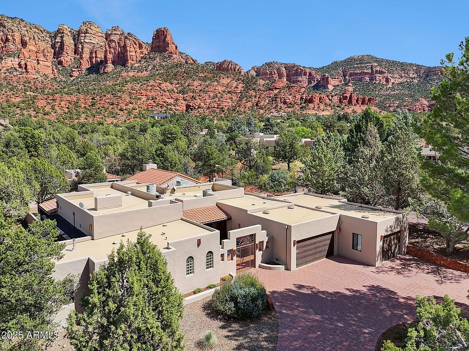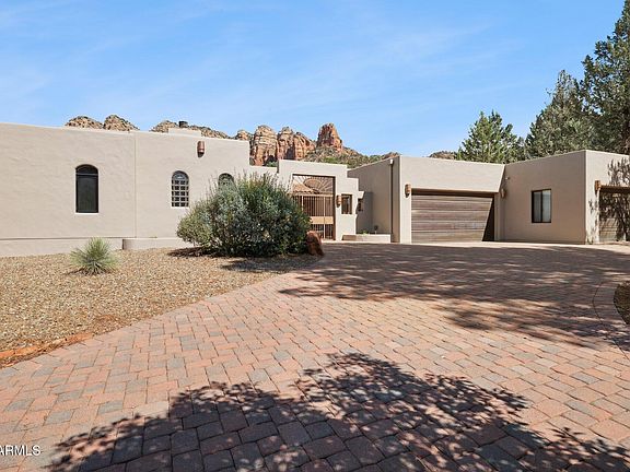 RED ROCK VIEWS!!! This 5 bedroom, 4 bathroom, plus Arizona Room, 1.3 acre property is located in a gated community and has been remodeled with all details in mind. Easy to navigate floor plan, vaulted ceilings with wood ceilings/beams, copper accents throughout (including sinks and tubs) and all on one level. HEATED 6 CAR GARAGE. Main house offers 4,295 sqft, Pecan Double Front Door with copper inserts, Living & Family Room each with gas hand cut stone Fireplaces, Formal & Informal Dining Room, Laundry Room in both Guest Suite and Primary Bedroom, 4 additional Bedrooms are split from Primary Bedroom, Bar with 2 Fridges & Wine Chiller and Gourmet Kitchen includes Subzero Refrigerator, Wolf Stove, Dishwasher, Island & Breakfast Bar. Garage features parking.