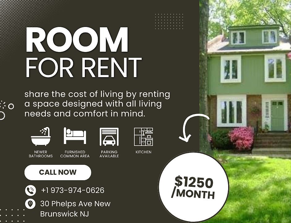 ROOM for RENT... renovated Master bedroom with private bath in 3 bedroom house for rent. This is a PRIVATE room with its own Private NEWLY renovated bathroom, in a shared house. The property is located at 30 Phelps Ave. in New Brunswick New Jersey. The neighborhood is located in a safe area and is a .3 mile walk to Rutgers University. The kitchen and bathrooms have been newly renovated. Appliances are new. Washer dryer in the basement. Parking available. Large backyard. Luxury landscape. Wifi and cleaning services included in rent