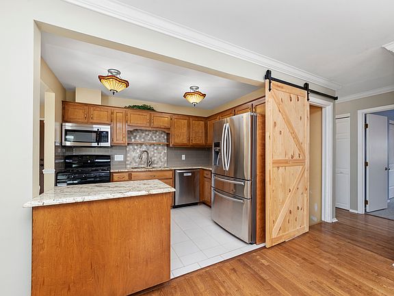 Welcome to this delightful 3-bedroom, 1-bath ranch home boasting 1,287 square feet of comfortable living space. This meticulously maintained property features hardwood floors throughout the family room, dining room, and hallway, creating a warm and inviting atmosphere. The heart of the home is the updated kitchen, complete with beautiful maple cabinets, sleek granite countertops, and a versatile movable island, perfect for both everyday living and entertaining. Each of the three spacious bedrooms is outfitted with new carpet, providing a cozy retreat for everyone. Step through a stylish barn door to discover the full basement, which is mostly finished and ready to accommodate your lifestyle needs. The large second family room, enhanced with an electric fireplace stubbed with a gas line, offers a perfect spot for relaxation and gatherings. Additionally, a flexible room in the basement provides endless possibilities, whether you envision it as a 4th bedroom, home office, or exercise room. Ample storage space completes the basement, ensuring everything has its place. The backyard is truly an entertainer's dream and a haven for relaxation. Enjoy the outdoors on the large covered deck, or step down to the stamped concrete patio, ideal for hosting friends and family. The fenced yard features well-maintained garden beds and a large storage shed, perfect for all your gardening tools and equipment. Additional highlights include an attached 2-car garage, offering convenience and extra storage. Situated in an incredible location, this home is just moments away from countless shopping, dining, and entertainment options. Plus, it's located within the highly sought-after 308 school district, making it an ideal choice for families. Recent Updates: 2023 - Washing Machine *** 2021 - Roof, Furnace, A/C *** 2019 - Patio.