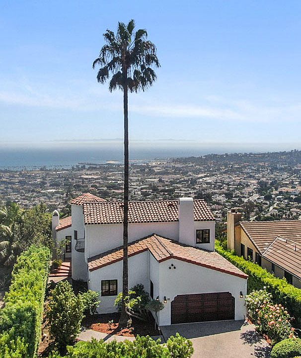Poised poetically on the American Riviera with stunning panoramic views of the City, Ocean & Harbor ''Vista Casa'' is a house you will want to stay home in! You begin the journey into this Classic Spanish home through custom carved wood doors that welcome you to the open spaces enjoying the massive views & accented with huge view windows, iron-decorated patios, sweeping staircases & art niches for your treasures. The newly freshened kitchen delights & includes a breakfast room plus an eat at peninsula. The upper level is the Private Master Suite Retreat with a breath-taking view roof top patio, 2 walk-in closets, dressing area & bright bath with French doors bringing in views of the mountains. The lower level is a office study retreat w/commanding views relished through a wall of glass