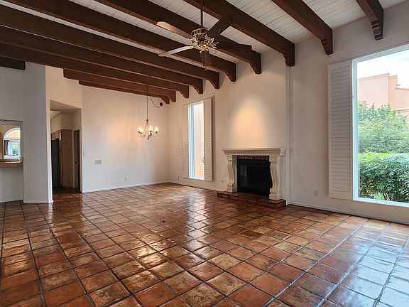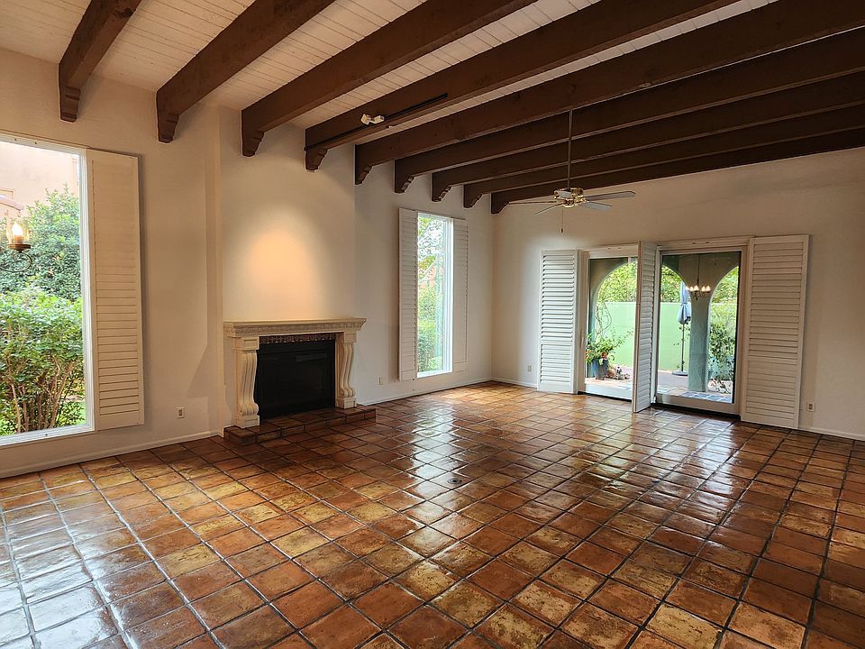 Two fireplacesSplit floor planSunny atriumPrivate walled courtyardHigh beamed ceilingsWrought iron gatePlantation shutters