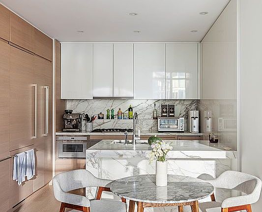 Inside, Residence 22F impresses with an open layout and refined details by Yabu Pushelberg. The Italian-crafted kitchen is a chef's dream, featuring Gaggenau appliances, Dornbracht fixtures, a fully vented range hood, wine refrigerator, and sleek stone-and-wood cabinetry. Every detail, from the garbage disposal to the vented washer and dryer, has been thoughtfully integrated for convenience and luxury.