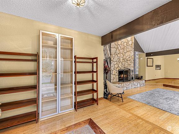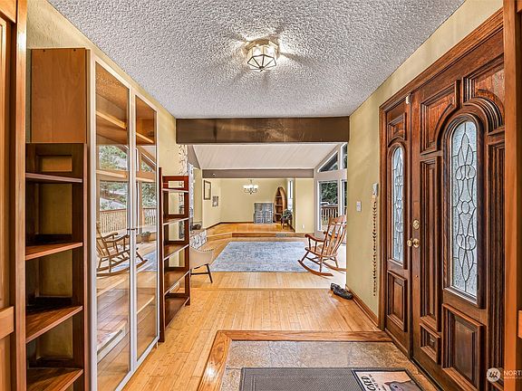 This classic northwest cedar home with soaring vaulted ceilings, large stone fireplace, and bamboo floors lives large with over 3000 square feet of space. Two primary suites, front and double back decks, and a heated workshop space in the garage provide room for everyone and everything. Main level primary bedroom features an extra deep soaker tub and the lower-level primary has an additional finished alcove room. The lot backs to 2-acre Treehouse Park and has a level, circular driveway in front for additional parking. Fantastic floorplan centers around the updated kitchen, with both formal dining and casual dining areas and two living rooms. New heat pump keeps you warm in the winter and cool in the summer. Comfort is king here!
