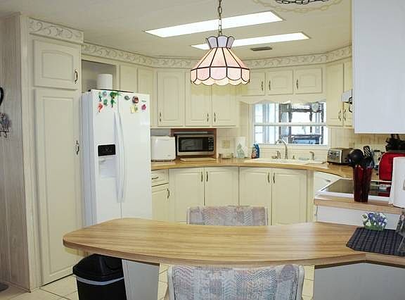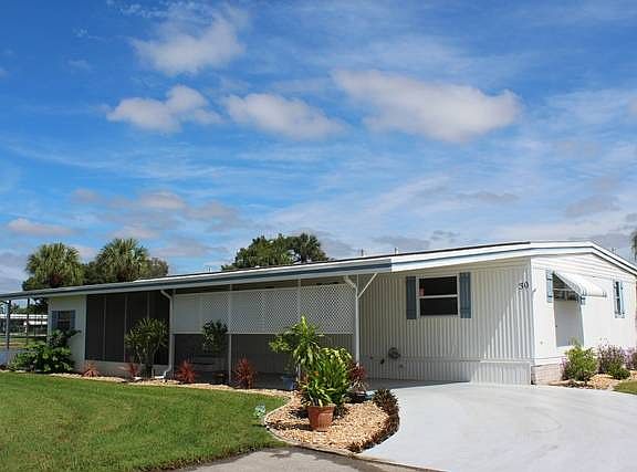 Perfect lake living in a recently updated home with brand new windows, plywood subfloors and laminate in almost every room! Convenient horseshoe shaped kitchen with breakfast table, new refrigerator and new dishwasher. Master bath with new countertop and flooring in the shower room. New vanity, sink and faucets, lighting and tile in the guest bathroom. Walk-in closets in both bedrooms. Multiple relaxing or entertaining areas including a nice outside covered patio and raised lanai with acrylic windows that easily slide open to enjoy the afternoon breeze or just use the dedicated AC unit. Beautiful views of the lake, swimming pool, tennis courts and more. Freshly painted exterior and driveway. Great location close to community amenities! Beautiful landscaping. Acceptable 4 point inspection available for review. Partially furnished. This home is in a very active, 55+ community with many clubs, sports and activities for the residents. Amenities include two swimming pools, three clubhouses, hot tub, sauna, state-of-the-art fitness center, library, billiard room, shuffle board, tennis courts and pickle ball courts. HOA fee includes: site lease, water/sewer, trash/recycle, lawn mowing, basic cable, 24 hour attended gatehouse and access to all community amenities.