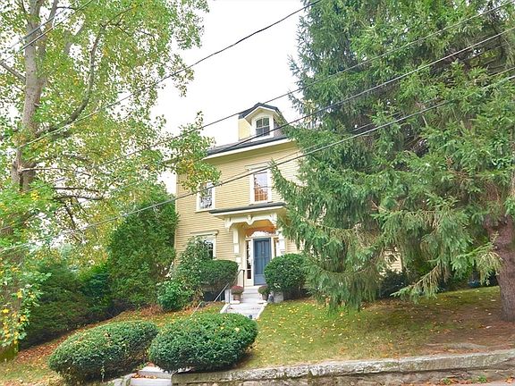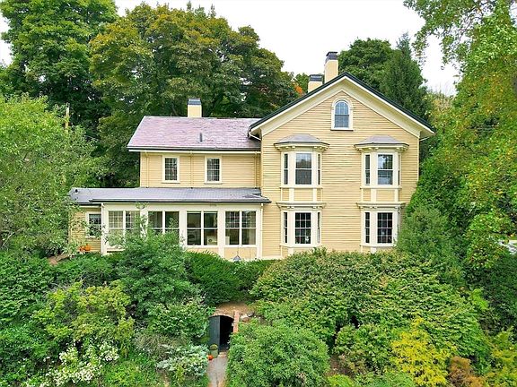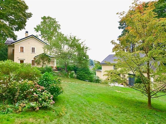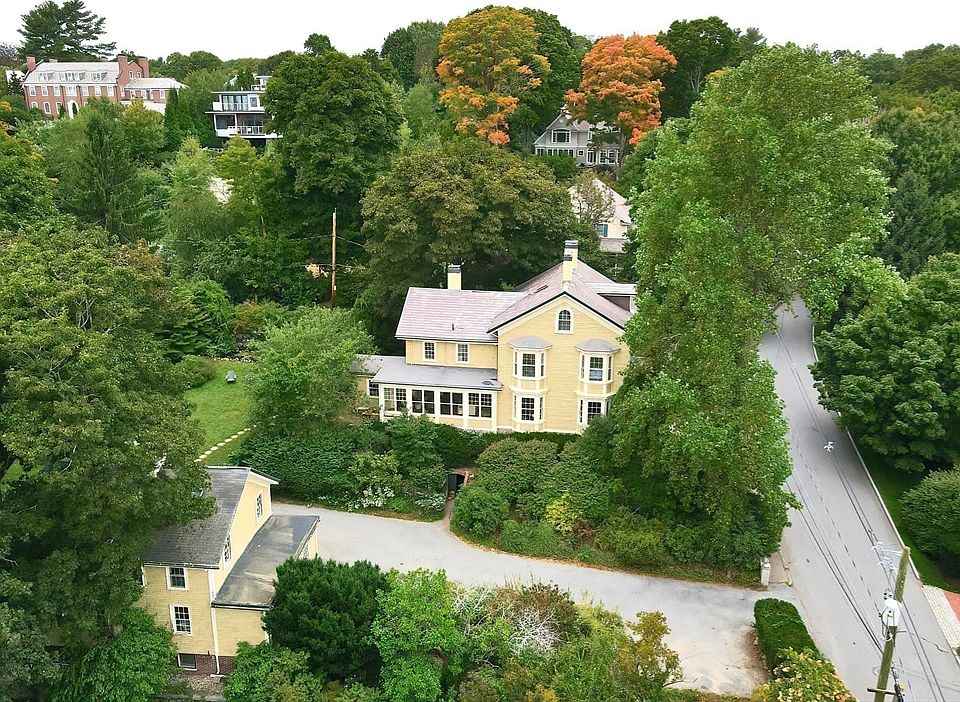 Grand In Town Historic Compound set behind granite posts and walls. The Albert Higgins house c1850 is one of Belmont's earliest homes. Perched above town with views of Boston in a sprawling country setting right out of Currier & Ives. The Main Italianate home features high ceilings, parlor windows & incredible details. This warm formal home features a welcoming gracious entry with sweeping Bullfinch staircase, an elegant front library, and chinoiserie painted oval dining room with bay window. A grand living room with arched marble fireplace is perfect for hosting holiday parties. Large sunny kitchen family room flanked with windows offers breathtaking scenic views of the grounds and city beyond. French doors lead to a spectacular yard complete with gardens, patios, stone walls and large trees. Upstairs offers numerous bedroom options including original top floor with natural wood. Restored 3 level Barn has 1 bedroom 1.5 bath apartment, work shop and ample storage. A Very Special Home!