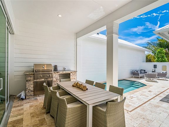 A modern twist on Key West style, this luxury cottage beckons you to enjoy the coastal lifestyle. A private courtyard welcomes you with a saltwater pool oasis & summer kitchen. Crafted with care, this home features CBS construction, a durable metal roof, and impact windows & doors. Indulge in statement finishes like hardwood and shellstone flooring, artisanal millwork, and chef's dream kitchen with stainless steel GE appliances and Quartz counters. The lavish master suite & spa bath are a true retreat. With beach and Jungle Trail access, this is island living at its finest!