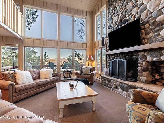 Walk to the Slopes in the Winter and Listen to the Soothing Sounds of the Cascading Waterfall from the Primary Ensuite in The Spring & Summer! Escape to Luxury in the Catskill Mountains - Your Dream Ski Chalet Awaits! Step into the extraordinary at this stunning ski chalet a short distance from the slopes at the Windham Mountain Resort! Perfect for city escapes or quality time with loved ones, this luxurious retreat is designed to help you unwind, reconnect, and create unforgettable memories. Unmatched Mountain Ambiance: This tri-level chalet offers warm wood interiors, soaring vaulted ceilings, and glowing fireplaces, creating the ultimate mountain vibe. The great room, with its dramatic vaulted ceilings, two-story wall of glass, and wood-burning fireplace, is a showstopper that brings everyone together with breathtaking Catskill Mountain views. A Chef's Dream & Ample Space: The high-end kitchen features stainless steel appliances, including a Wolf stove, and an open concept that blends seamlessly with the living space. With four-five bedrooms and four bathrooms, there's room for everyone to enjoy privacy and comfort. Two ensuites elevate luxury living. A primary ensuite on the top floor with sweeping mountain views and another on the lower level, perfect for hosting guests. A flexible loft space is ideal for a home office or a gym. A Mountain Paradise & Cozy Retreat: This chalet was made for mountain enthusiasts. A heated equipment room keeps your gear dry and ready for the next adventure. After a day on the mountain, either head to the hot tub for a soak or to the family room, where a wet bar with a second fireplace awaits the perfect spot to gather for cocktails. Share stories, laugh, and make memories that will last a lifetime. Perfectly Located: The paved driveway accommodates four or more cars, and Windham's charming shops, dining, and activities are just minutes away. The Ultimate Getaway: This chalet is more than a home; it's your personal escape. Whether savoring the mountain, relaxing by the fire, or enjoying a drink at the wet bar, every moment feels special. Use it as your private retreat or take advantage of its incredible rental potential. Your Catskill adventure starts now. Don't wait, reach out today and make this dream getaway yours!