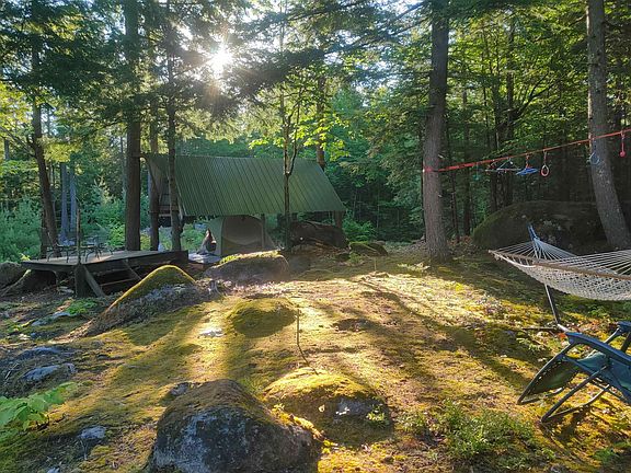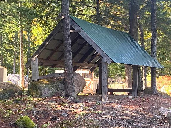 Serene 6.3-acre glamp-site in Center Ossipee on a 1 mile dead-end road where the spirit of New Hampshire's wilderness extends into the heart of the majestic White Mountains. This property offers a perfect haven for those seeking communion with nature, echoing Thoreau's call to live deliberately and reconnect with the natural world. Gaze upon a blanket of moss, quiet forest, ridgelines, and unspoiled wilds that inspire reflection and adventure alike. This lot abuts 900+ acres of conservation land a trailhead exists on the left boundary. Two miles to Sentinel Mountain Trailhead, 8.5 miles to White Lake State Park, 24 miles to Conway, 2-hours to Boston. The site includes a massive-metal-shade-roof for tenting, a private "necessary" room for a solar shower or composting toilet. Rain catcher for dishes, fireplace, and complete magical wilderness. A perc test has been completed for those seeking to build a cabin or vacation retreat. Power at the street.