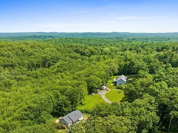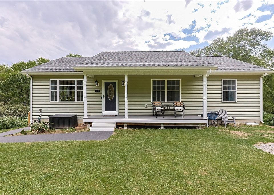 Immaculate 2017 ranch on 6+ private acres offering a charming farmers porch, open kitchen/living/dining floor plan, central air, and 1st floor laundry. The custom kitchen features granite counters, island, and upgraded cabinetry. Primary suite with private bath plus 2 additional bedrooms and full bath on the main level. The beautifully finished walk-out lower level adds a 4th bedroom, family room, exercise space, full bath, and private entrance—ideal for in-law, ADU, or extended family. Enjoy a large rear deck, storage shed, and 1-car detached garage. Two driveways provide plenty of parking. **you will be pleasantly surprised with the space inside!! Gorgeous country setting with amazing privacy, yet just minutes to the MA Pike, Rts 20, 9 & 84. Quick close available!