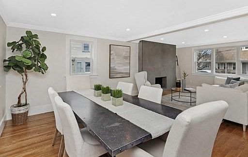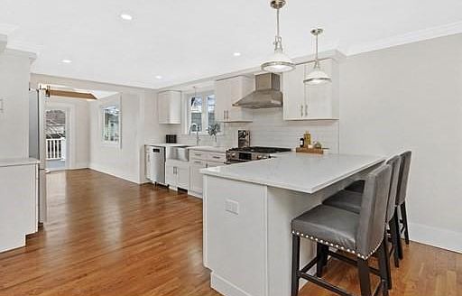 New to you...Total renovation! This expanded cape style home will simply "knock your socks off"! New roof, siding, composite deck, all new wiring (200amp service), all new plumbing, high efficiency instant hot water, new forced hot air system, central AC, and Pella windows throughout. Fully insulated. Stunning kitchen with stainless appliances, quartz counters, hardwood soft-close cabinets and decorative backsplash; breakfast island, open to dining and living room with fireplace. Recessed lighting. Beautiful hardwood flooring and crown molding! Designated 1st floor office space with spacious half bath. Family space with inlayed walnut, picture windows, vaulted/wood-beamed ceiling; step through the slider out to the new composite deck overlooking the side yard with a splendid, mature white birch tree. Corner lot! 3 full bedrooms with 2 breathtaking bathrooms on the 2nd level. Walk-out finished lower level with wet bar & wine fridge. Greenlodge school. Commuters delight. Home sweet home!