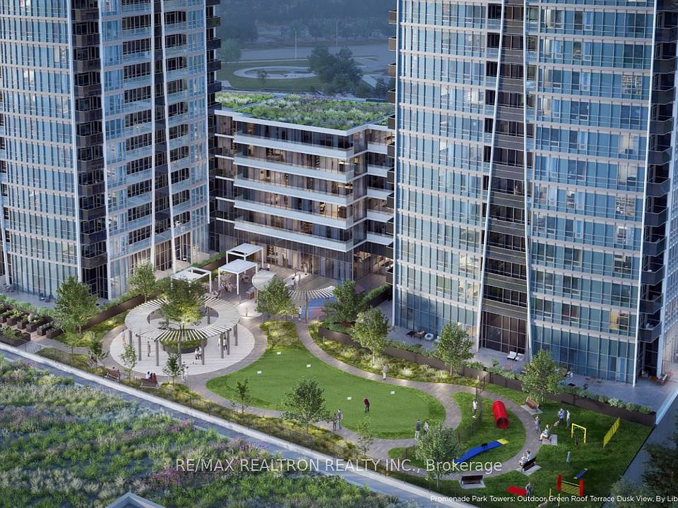 Brand New 1 Bedroom + Den with 2 Bath, Parking and Locker at Promenade Park Towers! Enjoy direct indoor access to the Promenade Shopping Centre in Vaughan's newest landmark community - a dog-friendly building featuring a seasonal dog run and pet wash area. This beautiful 645 sq ft suite offers a highly functional layout with open-concept living, floor-to-ceiling windows, and an 80 sf balcony. Premium Finishes include quartz countertops, stainless steel appliances, European-style cabinets, and ceramic & laminate flooring. Over $14,000 in upgrades: kitchen island with storage, sliding glass shower door in the primary bath, zebra blinds in both rooms, framed mirror closet door in the bedroom, and smooth ceilings throughout. Additional custom-built storage features include extra upper and lower kitchen cabinetry with a matching countertop and IKEA cabinets in the den. The clean white/gray/navy palette enhances the suite's modern aesthetic and maximizes space. Outstanding building amenities: 24-hour concierge, half-acre outdoor green roof terrace (with dog run area), fitness centre with yoga room, party room, private dining room, indoor/outdoor children's play areas, study lounge, cyber lounge, sports lounge, billiards, media/game room, cards room, golf simulator, and guest suites.Prime location: Steps to Promenade VIVA Terminal, transit, library, parks, nature trails, golf clubs, community centre, schools, theatres, restaurants, supermarkets, and all conveniences at Promenade Mall. Easy access to Highways 407, 7, 400, 404 & 401.1 underground parking space and locker included. Connected modern living at its finest!