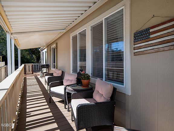 This cozy retreat in Solvang's beautiful Rancho Santa Ynez Mobile Estates is a three-bedroom, two-bath, 2003 Silvercrest Home. At just over 1700 square feet, this well-maintained home is a treasure. As you approach the home, you can appreciate the lovely curb appeal. Up the steps, you will find a spacious front porch and the front door into the living room. The cathedral ceiling and skylights make this space feel even larger than it is, and the fireplace adds a lovely warm ambiance. This room leads to the spacious formal dining room as well as the generous-sized island kitchen with breakfast nook and a plethora of charming cabinets and counter space. Down the hall you find the primary suite, two secondary bedrooms, and a full bath with tub/shower. The welcoming and expansive primary..... bedroom is a true haven. The adjoining bath features double sinks and a nice-sized shower along with lots of storage. The indoor laundry room with plenty of storage and a built-in desk/office space is accessed from the kitchen and opens to a roomy back deck and the low-maintenance backyard. A covered carport and storage shed complete this home's many amenities. Rancho Santa Ynez Mobile Estates is a Senior Park requiring one owner be 55+ and any second person at least 45 years of age. The space rent will be $1,291.00 monthly to the new buyer and includes water, sewer and trash. The community has everything you could want including a pristine pool with jacuzzi, bocce ball court, golf course, and a clubhouse with library, pool tables, kitchen, and large gathering area. Located by a park-lined section of the Santa Ynez River, this hideaway has a lovely quiet appeal and yet boasts easy access to the charming Danish village of Solvang. You will enjoy all the comforts of this home and its location in the beautiful Santa Ynez Valley where the tranquil rolling hills counterpoint the area's many attractions which include local annual festivals, a wonderful open-air theater, fabulous restaurants, a multitude of wineries and shops, and golf.
