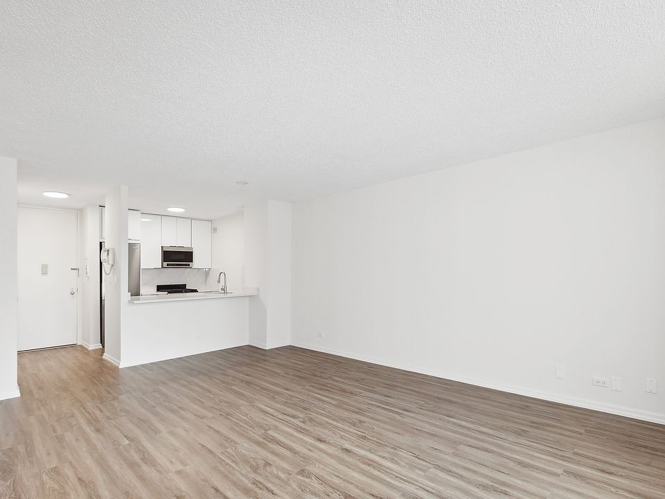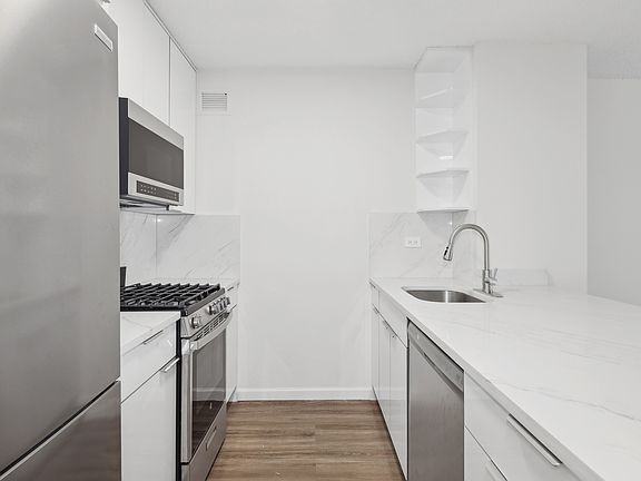 The apartment features a brand new renovated kitchen with stainless steel appliances, marble countertops, dishwasher, breakfast bar, and great cabinet space. There are new hardwood floors throughout. The bedroom is very spacious with tons of closet space, and can easily fit a king sized bed. The marble bathroom is also newly renovated. This apartment also has a tremendous amount of closet space and light, and there is laundry right on the floor.
