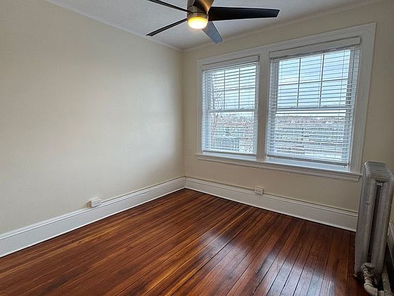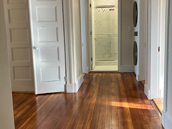 The large, multi-floor apt features hardwood floors, large sunlit windows, recent renovations in the kitchen and bathrooms, stainless steel appliances, circular accent windows and other elegant details throughout, a new washer and dryer in unit, built-in storage, large closets including some walk-in closets, a pantry closet, ceiling fans in the rooms, marble shower tile, and a deck.