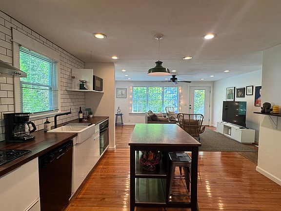 This sweet and inviting home features an open-concept layout with a modern kitchen that flows into the vaulted-ceiling dining area and a cozy living room perfect for relaxed, comfortable living during the off-season. Hardwood floors throughout add warmth and charm to every room.