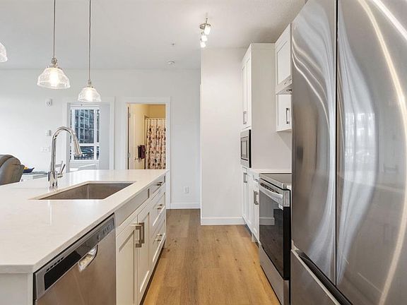 Welcome to Unit 117! This incredible gated, walk-up unit is arguably the nicest in the building. Upon entering, you are greeted by a bright, spacious open floor plan featuring a chef’s upgraded kitchen, complete with a built-in microwave, gorgeous centre island, and ample cabinetry for exceptional storage. The unit also includes a custom wall pantry and a cleaning/laundry closet, providing even more function and convenience to your space. Off the living room, you’ll find a sizeable primary bedroom with a deep two-sided closet and a spa-inspired 4-piece ensuite with linen cupboard. Completing this unit is a second bedroom and a 4-piece main bathroom. Additional highlights include central A/C for year-round comfort, a titled underground parking stall with storage right in front, and a private walk-up patio overlooking a beautiful green space with plenty of visitor parking right outside the gate. Located just steps from shops, grocery stores, coffee shops, and public transit, this unit offers the perfect blend of luxury and convenience in pet-friendly Walden Place. Don’t miss your chance to call this stunning unit home — schedule a private tour today!