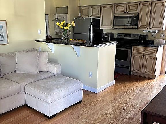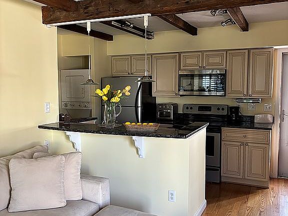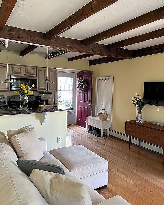 Welcome home to this adorable 1 bedroom, 1 bath apartment just a 5 min walk to the heart of downtown Concord. Bursting w/character and charm, this unique space features beautiful exposed wooden beams, offering a warm, rustic touch that sets this apart from the rest. The open-concept living area is filled with natural light and features hard wood floors, high ceilings, and a cozy yet spacious feel. The kitchen is well equipped w/ modern stainless steel appliances, upgraded cabinets and additional granite bar height counter space, perfect for daily living or entertaining guests. The bedroom provides a peaceful retreat with charming details and ample storage.