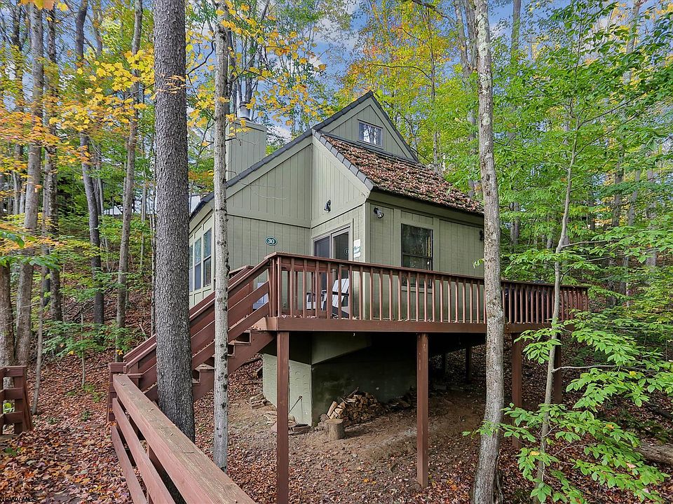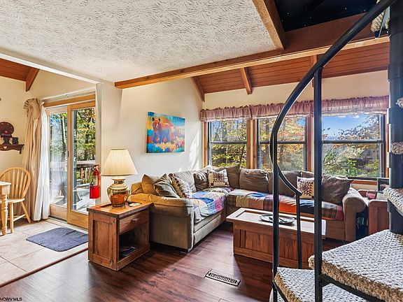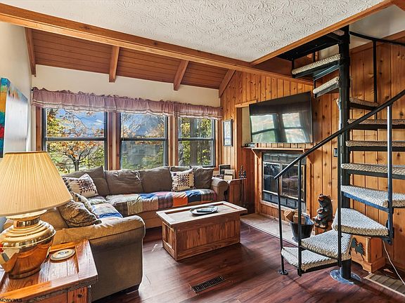 Tucked in among the trees, this unique elevated cabin offers the perfect blend of rustic charm and comfort. Step inside to find a bright and inviting living space with lots of natural light, a wood-burning fireplace, perfect for chilly mountain evenings. Enjoy morning coffee and evening sunsets on the spacious deck surrounded by nature. This mountain gem is full of character and opportunity. Rental income available upon request.