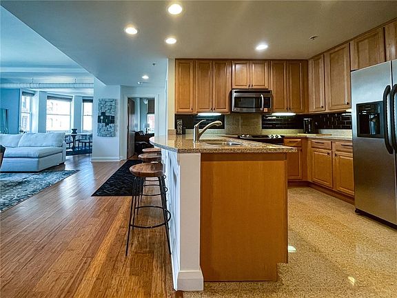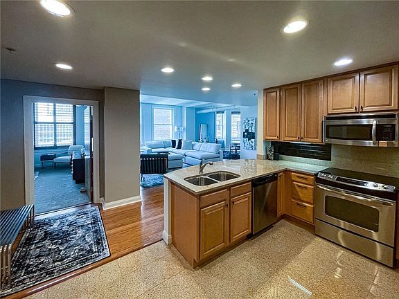 Corner Unit at the Carlyle! The Washington floor plan is undoubtedly the most coveted floor plan that the complex has to offer. The city block is now right outside your living room with unique panoramic views that include a direct sight of PPG Place. Speaking of your master bedroom, you'll love the walk-in-closet and the en-suite master bath with dual vanities, a spacious shower, and granite tile throughout. The kitchen spares no expense with a breakfast bar and stainless steel appliances. The large living room provides options for different set-ups and features 11' ceilings, an accent wall, and wall sconces. The dining room offers more sconces and a rounded wall. NEW bamboo floors. New Kitchen tile backsplash. NEW CUSTOM Plantation shutters. NEW carpet in master. NEW lighting fixtures throughout. NEW electrical on accent wall in living room. Additional plantation shutters available for windows in living room or other bedroom.