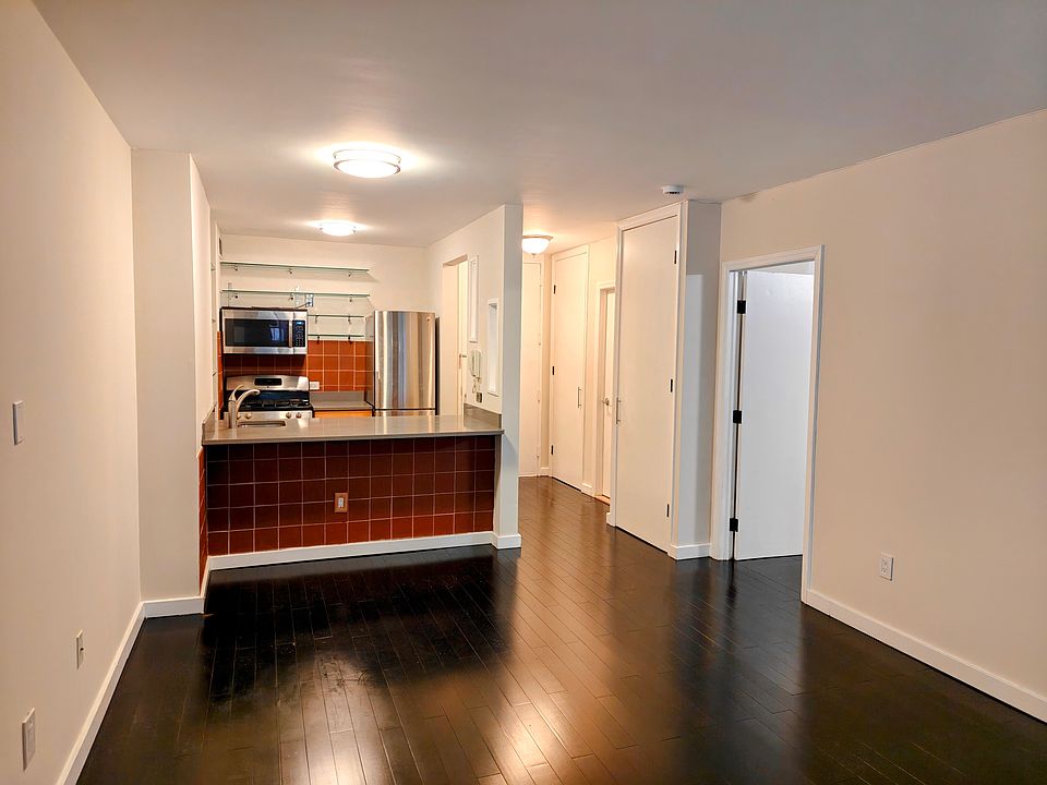 Updated modern one bedroom, one bath unit with large balcony overlooking court yard. Pass through kitchen with spacious counter top and stainless steel appliances. Dark stained hardwood flooring throughout this cozy move in ready unit. Full service building with 24 hour doorman, fitness center and laundry.