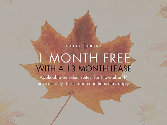 - Special offer! Limited Time Offer: Get 1 Month Free with a 13 Month Lease, for November 1st move-ins only. - *Offer valid on select suites. Additional terms and conditions may apply.