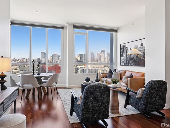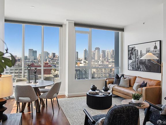 Distinguished by soaring ceilings and dramatic floor-to-ceiling windows, this impressive 2-bedroom, 1-bathroom residence offers an inspiring sense of volume while showcasing iconic San Francisco skyline VIEWS from every room! The thoughtfully designed layout includes a sleek kitchen with stainless steel appliances, stone counters, and ample storage that opens seamlessly to the living and dining area, perfect for both entertaining and everyday living. Two bedrooms provide flexibility for guests, a home office, or a creative space. The bathroom is finished in a clean, modern aesthetic and features an illuminated vanity mirror. Additional perks include in-unit laundry, hardwood floors throughout, and one-car parking building's secured garage. Arterra residents enjoy a host of amenities: an attended lobby, state-of-the-art gym, guest suite for visiting relatives, community lounge, herb garden, and a rooftop deck with a BBQ! Perfectly located, you're just moments from exciting Oracle Park (home of the Giants), Chase Center (home of the Warriors), tranquil waterfront trails, shopping, dining, groceries, coffee, & multiple transit/freeway connections. Unit #911 strikes the perfect balance of comfort and convenience, an elevated lifestyle in Mission Bay's premier full-service community!