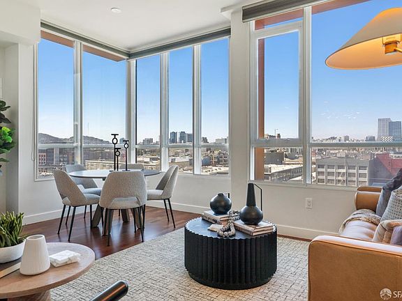 Dramatic floor-to-ceiling windowsSan francisco skyline viewsSoaring ceilingsStainless steel appliancesLiving and dining areaStone countersAmple storage