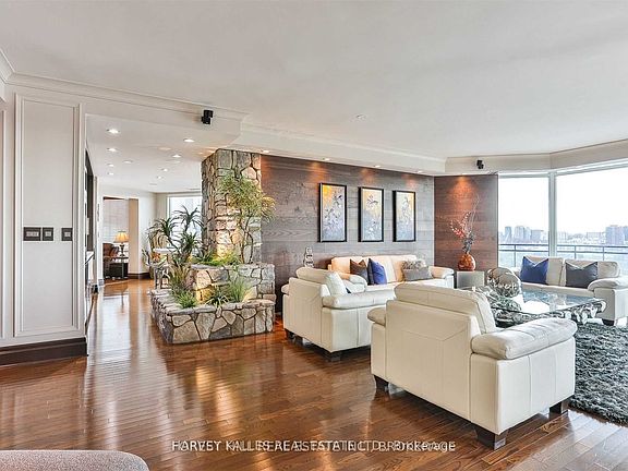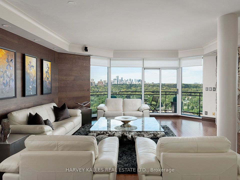 Framed by the endless green canopy of the Rosedale Ravine, this residence commands one of the most coveted vantage points in Toronto. Spanning over 3,000 Sq.ft., it is designed with both elegance and ease in mind. Floor-to-ceiling windows flood the space with natural light, framing uninterrupted majestic views of the Ravine and beyond, while travertine and custom wood-accent walls add warmth and timeless sophistication. The thoughtful split-level layout strikes the perfect balance between connection and privacy, featuring expansive principal rooms, a cozy family room with fireplace, and a chefs kitchen appointed with a Wolf Gas Cooktop, StainlessSteel Appliances, Wine and Beverage Fridges, and a splendid Centre Island with integrated storage making meal prep effortless. A custom-designed servery enhances both everyday living and grand entertaining, while the surround-sound system and independent temperature control zones elevate comfort and convenience. New Hardwood Flooring throughout main living areas. The primary suite is a private retreat, with a sitting area and fireplace, a resort-worthy five-piece ensuite with jacuzzi, a walk-in closet with custom organizers, and a walkout to a private balcony. Two Parking Spaces with EV chargers, all-inclusive Maintenance Fees, and a walkable location in the heart of Toronto mere steps to Yorkville complete this exceptional offering. Residents also enjoy access to a saltwater pool, guest suites, and an impeccable 24/7concierge.