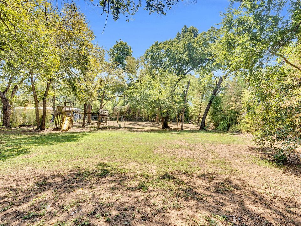 Wood-burning fireplaceJungle gym swing setLarge treed yardGalley-style kitchenOversized lotMature trees