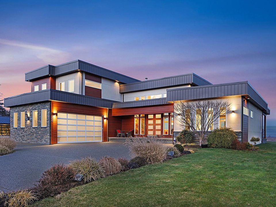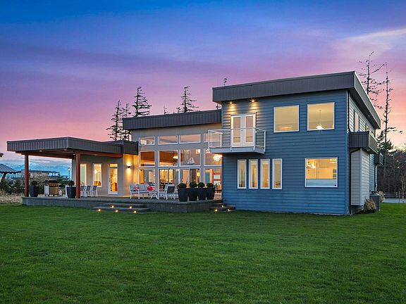 Stunning West Coast Ocean views across the Strait of Georgia to the snow-capped Coast Mountains beyond. Delivering panoramic views from all levels, this high-bank waterfront home of 3,415 sf, 4 BD/ 3 BA offers chic contemporary styling incorporating simple luxury and refined elegance. Streaming sunlight highlights the bright open plan w/ floor to ceiling windows & 15’5” ceilings in the Great Room, striking bronze tiled propane gas fireplace w/ fir timber mantle. Bright white kitchen w/ contrasting wood finished island, Wolf gas cooktop, Jennair dbl oven, pantry, & access to the covered patio w/ 4 skylights. Adjacent to the kitchen is a den/bedroom/formal dining room. The primary suite offers luxury, solitude, and 5 pce ensuite w/ soaker tub, glass & tile shower, dual sinks and views! Upstairs there are 2 bedrooms, den/small bedroom, & entertainment room w/ wet bar, ideal for media, pool table, & access to the deck. Doggie shower, 6’ crawl, Longboard aluminum siding ‘Built to last.’